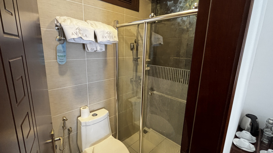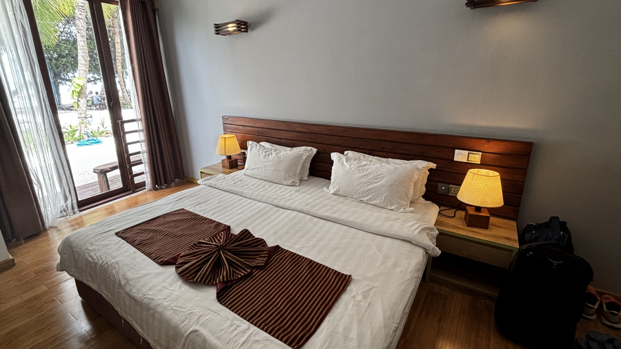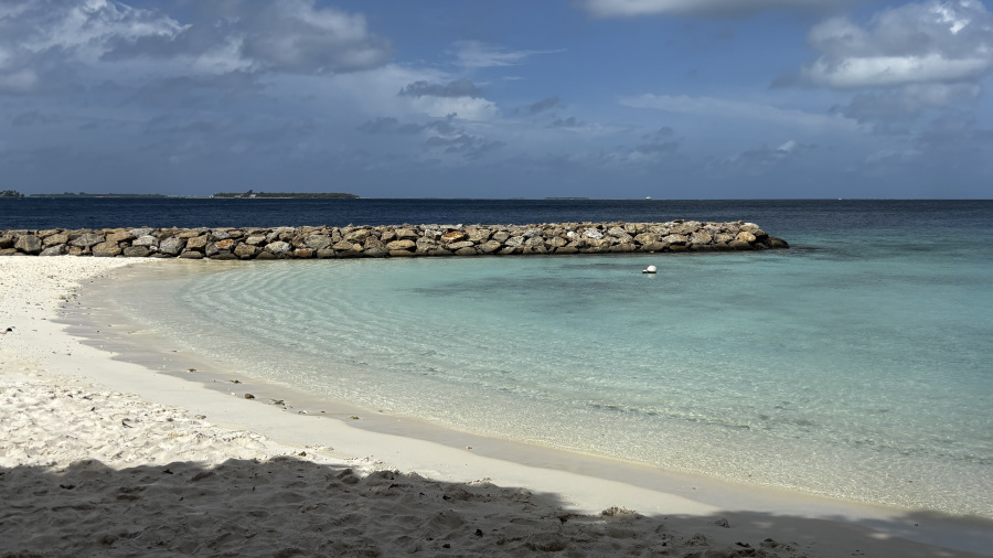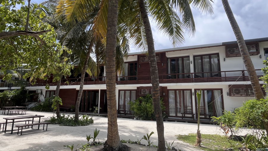 Dharavandhoo je majhen otok v Baa Atolu, kjer še midva do sedaj nisva bila. Ima že kar nekaj nastanitev in tudi gradnja poteka vsepovsod. Hitro se razvijajo in čez kakšno leto ali dve bo še bistveno več nastanitev kot jih je sedaj. Midva sva si želela biti povsem na bikini plaži, zato sva izbrala Aveylo. Moram priznati, da je zelo lepo umeščen, je pa tudi že precej dotrajan. A midva sva si želela lokacijo in sva jo dobila. Soba je bila velika, kopalnica utesnjena, a je imela zelo dober pretok vode in vročo vodo. Meni je to zelo pomembno po potapljanju, saj sem vedno zmrznjena in umiti moram opremo. Restavracija je bila odlična, tako da sva jedla kar ves čas pri nas. Iz sobe sva imela izhod direktno na krasno plažo in zelo veliko sence ter ležalnike in brisače. Plaža je bila še pred leti mnogo lepša, a jo je povsem odnašala erozija, zato so žal morali narediti valobrane. Ta del plaže na otoku je bikini, zato ste lahko normalno v kopalkah. Bilo je tudi več kot dovolj sence in celo zvečer smo lahko opazovali sončni zahod s plaže. Mivka krasna, v vodi pa kar nekaj koral in kamenja. Mnogi so se tukaj snorkljali in zelo pohvalili greben, ki je praktično takoj za valobrani. Nisem poizkusila, zato ne morem potrditi. V hotelu sva imela tudi ves čas na voljo brezplačno pitno vodo, kar je meni pomembno, zaradi odpadne plastike. Hotel je bil praktično precej prazen. Dva večera sva imela še skupino desetih prijaznih in vljudnih Kitajcev, potem pa sva bila 3 noči sama v hotelu. Zadnji dan je prišel še en par in en fant. Luksuz in takšen mir, da sva se res noro naspala in odpočila.
