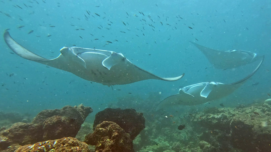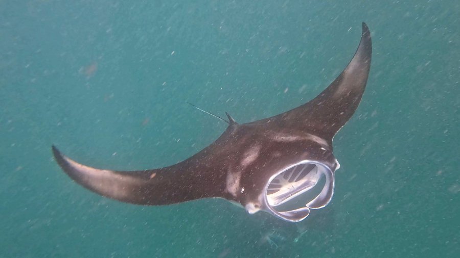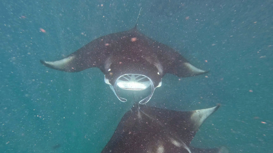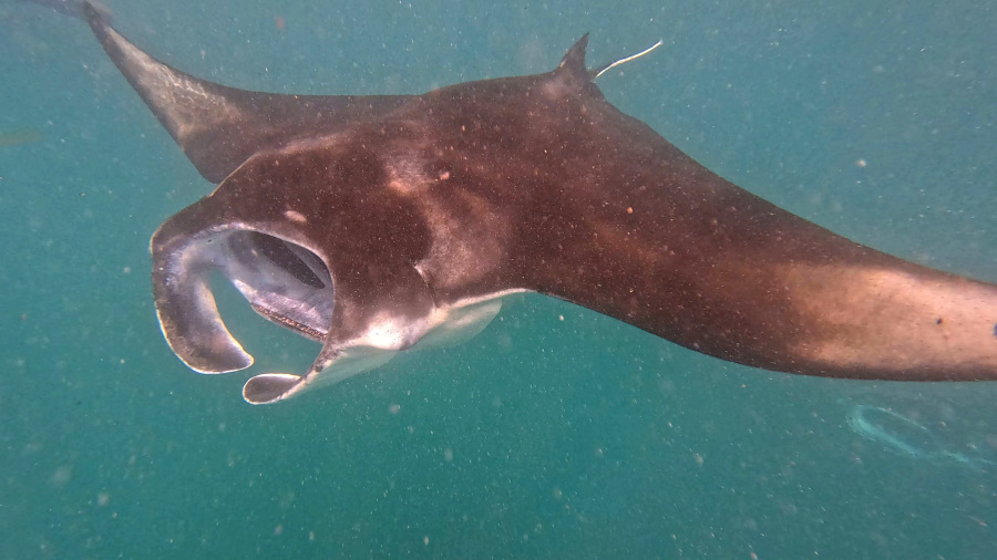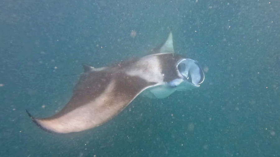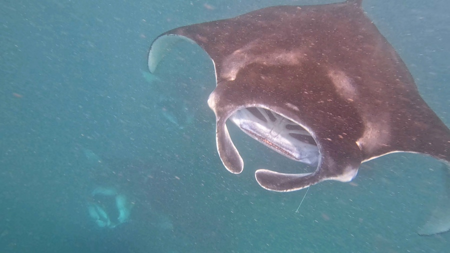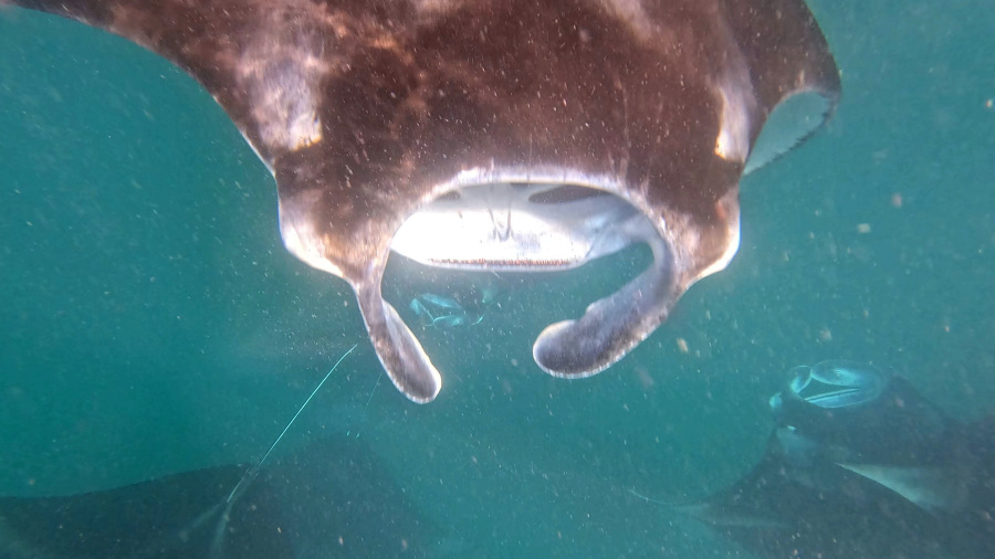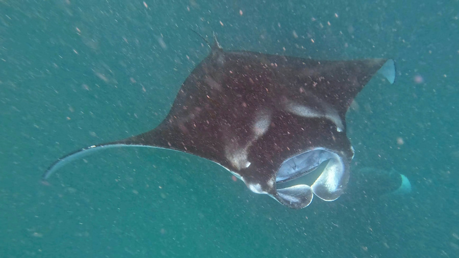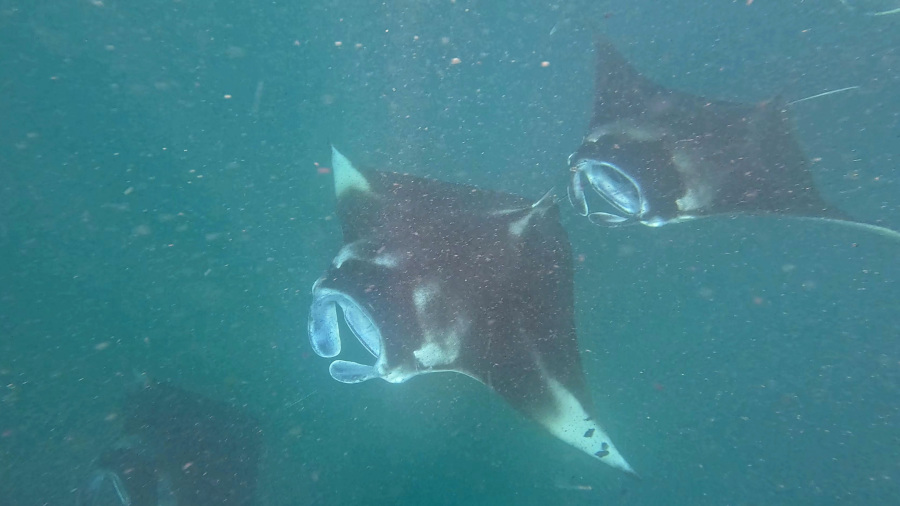 Tokrat gremo s hitrim čolnom. Vsi povsem navdušeni. Mante so v zalivu. Ura je bila 13:30. V zalivu je prepovedano potapljanje, zato vsi snorkljamo. Veliko čolnov je že tam, mi smo verjetno med zadnjimi. Morje je precej valovito, tudi do enega metra so visoki valovi. Inštruktor vzame v roke dron in pregleda, kje se mante nahajajo. Z drugo inštruktorico gremo v vodo. Veliko je plavanja, ker v zaliv čolni ne smejo. Plavamo v smeri drona in potem poezija. Prvih 15 minut je bila naša skupina sama s celo skupino mant, ki so ves čas plavale na površju mimo nas – manta spredaj, zadaj, spodaj, levo, desno. Povsod. Kar vlakci mant, ena za drugo. Planktona ogromno in to je njihova pojedina. Vrtele so se, delale prevale… to sem sanjala celo moje življenje in sanje so se mi uresničile. Tam potem ni bilo potrebno veliko plavati, ker smo bili ves čas med njimi. Eno uro smo doživljali nepozabne trenutke z mantami. Na koncu so jih menda tisti dan v zalivu našteli več kot 100. WOOOOOOW. Kakšna sreča.