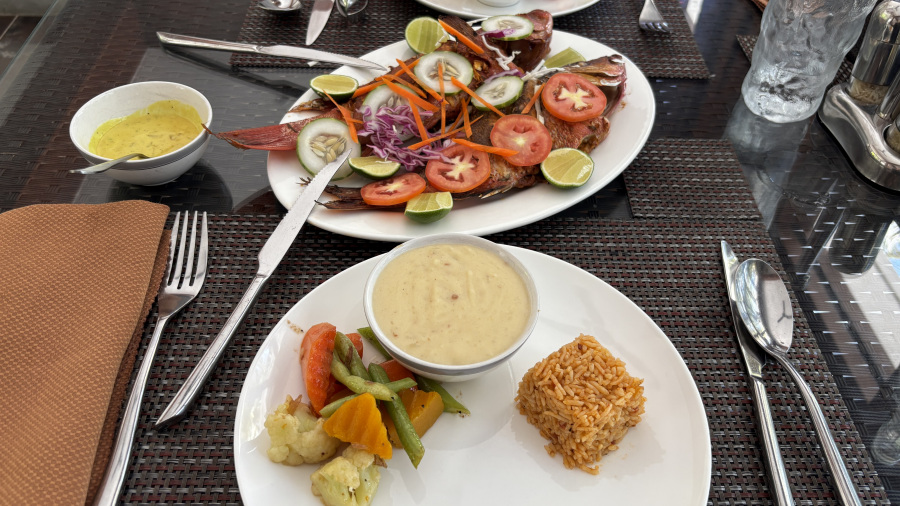 Tokrat sva bila povsem sama v hotelu, zato sva si že včeraj naročila za današnje kosilo dve sveži ribi s prilogami. Kosilo je bilo odlično in zrela sva bila še samo za eno uro počitka v senci na ležalniku pred hotelom. Čez dan je res peklensko vroče, tako da se je potrebno skrivati pred soncem.