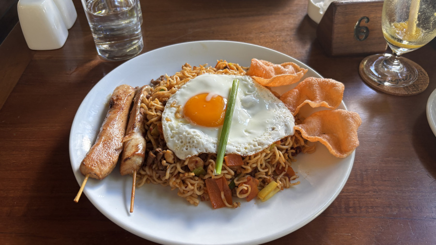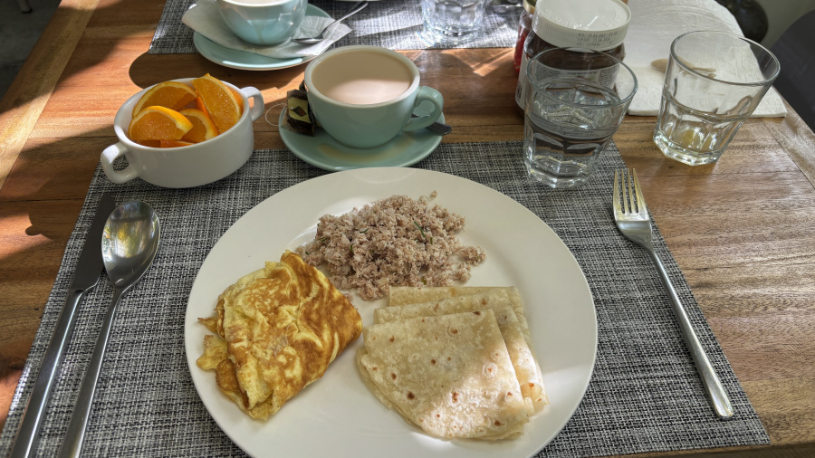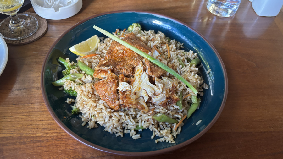 - kosilo (riba z rižem, nasi goreng, 2x orange juice, kava z mlekom) = 680 MVR (38,9 EUR)