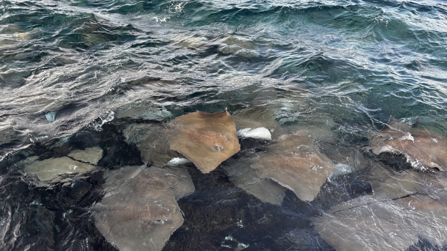 Od tam sva se sprehodila ob obali nazaj do tržnice. Tam je moje srce. Malo na veleprodajno tržnico med ladje, malo na tržnico s sadjem, malo na ribjo tržnico. Vse že poznam. Pri istem gospodu kupim svež kokos, za povrh dobim slastne banane. Ustaviva se tudi ob morju, kjer na desetine morskih bičev čaka na svoj grižljaj od ribičev. Le-ti mečejo ostanke v morje in morski biči so se izredno hitro navadili na lahko dosegljivo hrano.