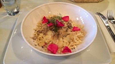 Domači štrigoli s tartufi Hobotnica v padelci na rdeče s polento Mousse temne čokolade s solnim cvetom