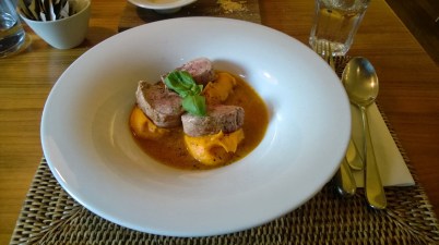 Svinjska ribica na posteljici pomarančnega pirejaBrioni, Kranj Ramsteak s hišnim krompirčkom in zeliščnim maslomBrioni, Kranj